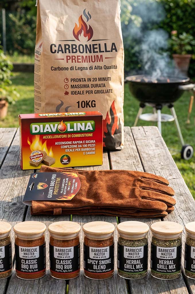 Per gli amanti del barbecue mettiamo a disposizione tutto il necessario: carbonella, diavolina, guanti, aromi e spezie per preparare una grigliata perfetta in totale comodità.